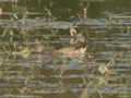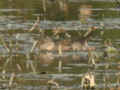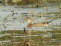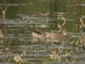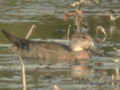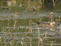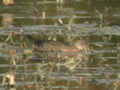 Plain brown upperparts with reddish patch on the scapulars, plain grey-brown flanks, paler, whitish undertail-coverts, dark upperwing (greenish?), green speculum with white edge save for the inner feather(s) côté droit/right side :