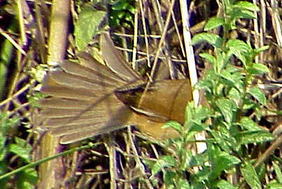 Cettia cettiMagnus Hellström, Sweden, (2·1·01) : How come you don't consider cetti's warbler as an option for the identification? The bird only shows 10 rectrices!Lionel Maumary, Switzerland (4·1·01) : Je suis aussi de l'avis qu'il s'agit d'une Bouscarle de Cetti: aucune rousserolle n'a une queue aussi étagée. D'autre part, les rectrices sont trop larges et arrondies au bout pour une rousserolle, sans parler de leur nombre (10, apparemment complet) qui est diagnostique de la Bouscarle. La mandibule supérieure du bec est hypertrophiée, ce qui allonge le profil de la tête.